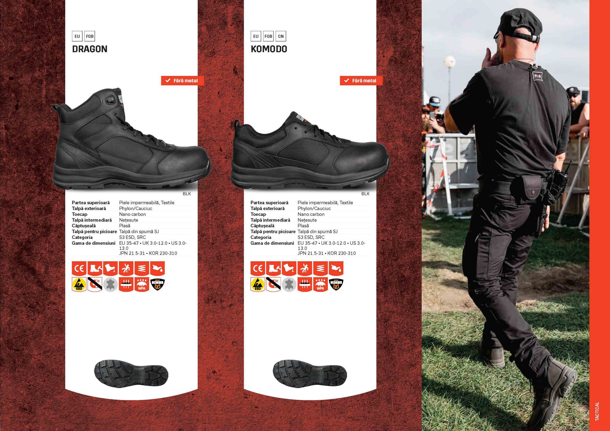 Beschreibung: Der KOMODO ist ein durchtrittsicherer, leichter Sicherheitsschuh mit einer leichten Zehenkappe und einem atmungsaktiven Futter. Dieser Schuh entspricht dem Sicherheitsstandard S3 und bietet den ganzen Tag über Komfort. Zehenkappe aus NanoKohlensto: Ultraleichtes High-Tech-Material, metallfrei, ohne thermische oder elektrische Leitfähigkeit. Metallfreie Sicherheitsschuhe sind in der Regel leichter als normale Sicherheitsschuhe. Sie eignen sich auch hervorragend für Berufskräfte, die mehrmals täglich durch Metalldetektoren gehen müssen. Empfohlene Branchen: Automobilindustrie, Lebensmittel, Logistik, Produktion, Einsatzkräfte, Uniform. Empfohlene Umgebungen: Extrem rutschige Oberflächen, Feuchte Umgebung. Sicherheitsstandards: S3 / ESD, SRC.