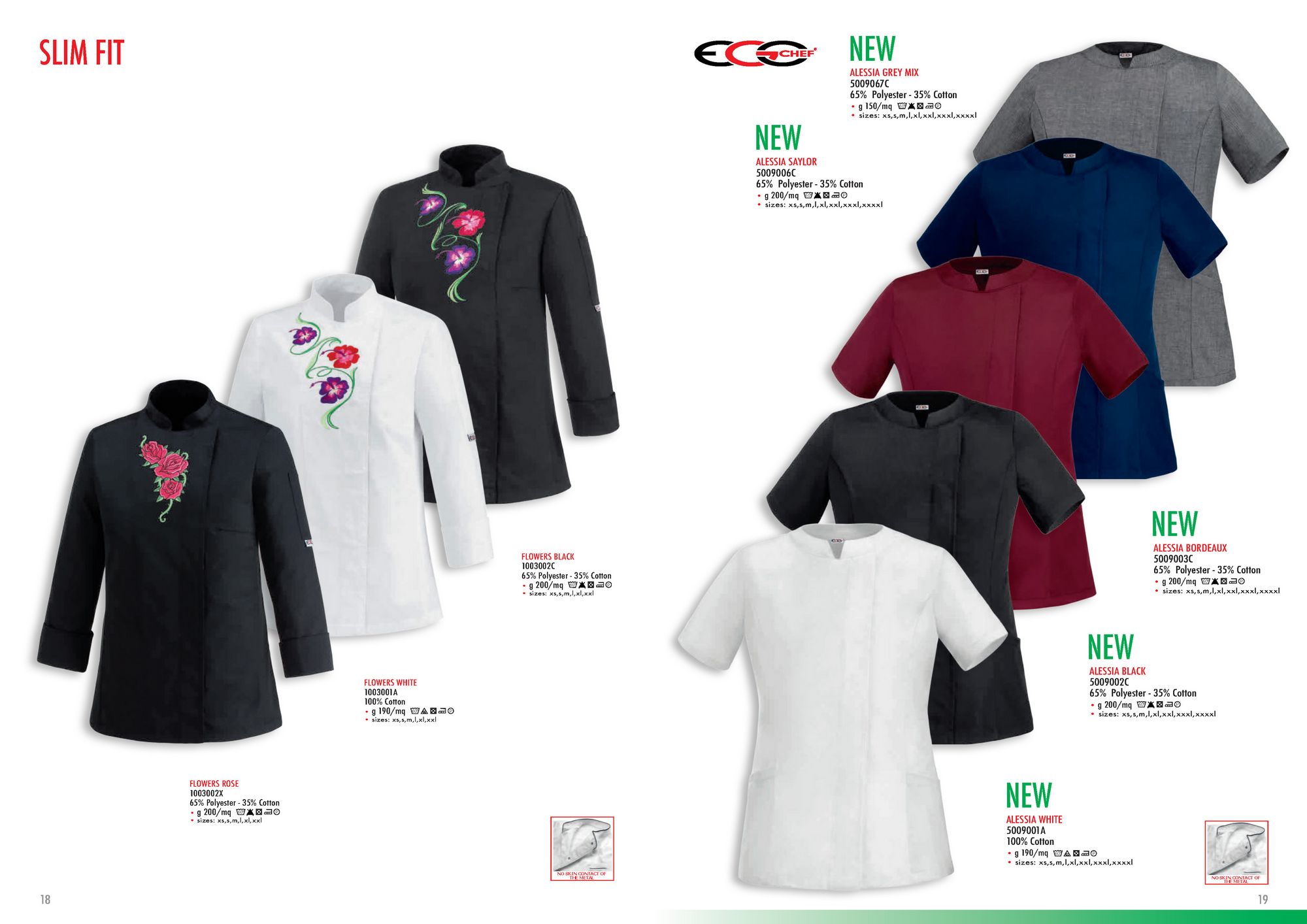 Beschreibung: Kochjacke für Damen, mit Frontverschluss mit versteckten Klammern und buntem Blumendetail auf der rechten Brustseite.