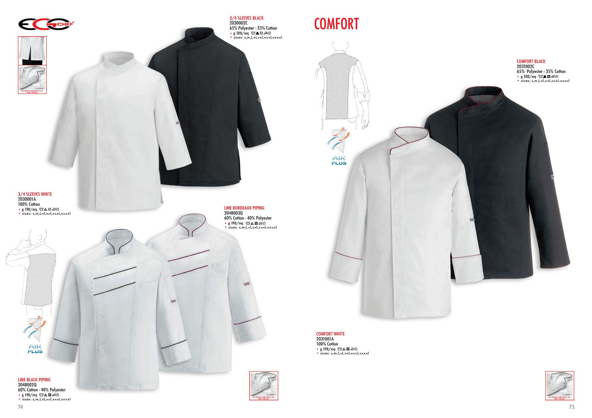 Beschreibung: Unisex-Kochjacke mit Frontverschluss mit versteckten Heftklammern, Seitenschlitzen und 3/4-Ärmeln.