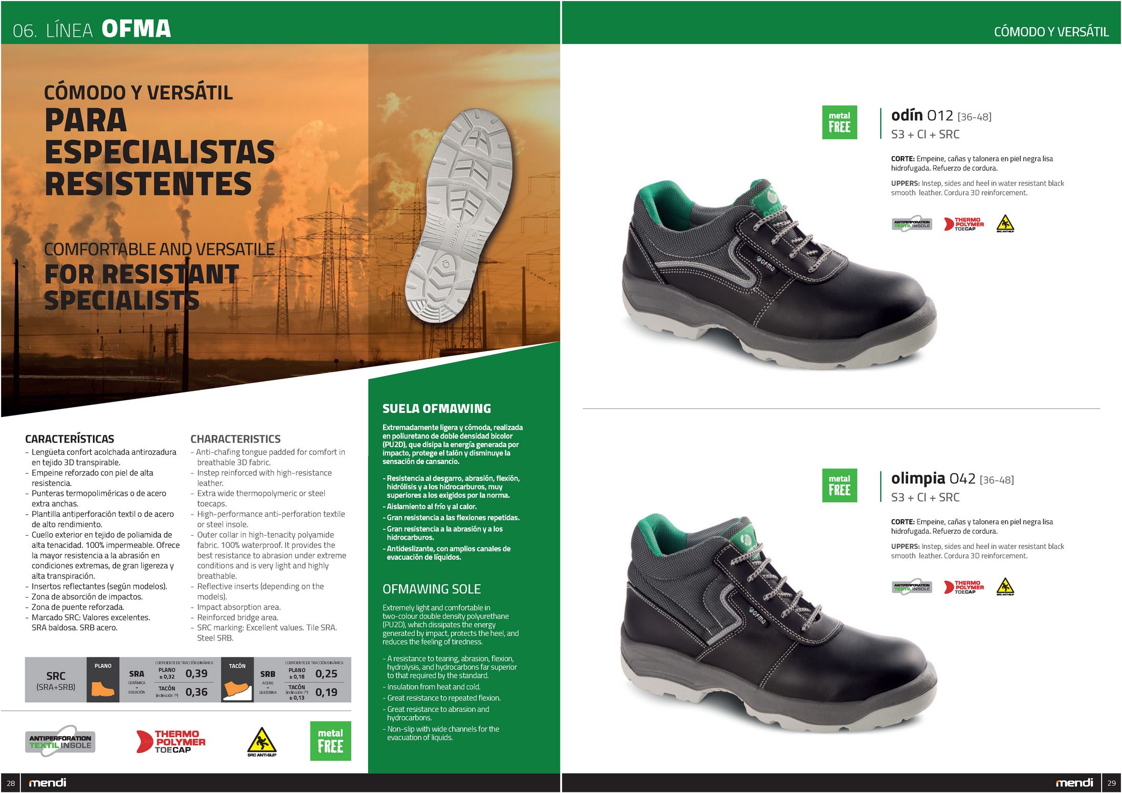 SOLE: The new OFMA sole is extremely light and comfortable. It is made of Double Colour Double Density Polyurethane (PU2D). Thanks to this material, the energy by impact generated in each step is dissipated, reducing the feeling of tiredness and protecting the heel area. Its composition provides great insulation against cold and heat, whilst its reinforced bridge provides great resistance to repeated bending movements, which translates into excellent durability.