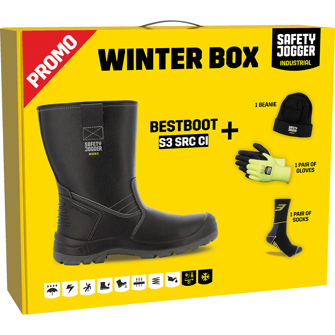 Description: With the Winterbox, you get a complete ensemble that combines safety and comfort, ensuring that you can face the challenges of winter work with confidence. This set includes the Alaska safety boots. It also includes a pair of winter working gloves to ensure your hands stay protected while allowing easy working, and a Safety Jogger beanie, providing an additional layer of warmth for your head and ears. Industries: Automotive, Chemical, Construction, Logistics, Mining, Oil & Gas, Industry. Environments: Cold environment, Muddy environment, Uneven surfaces, Wet environment.