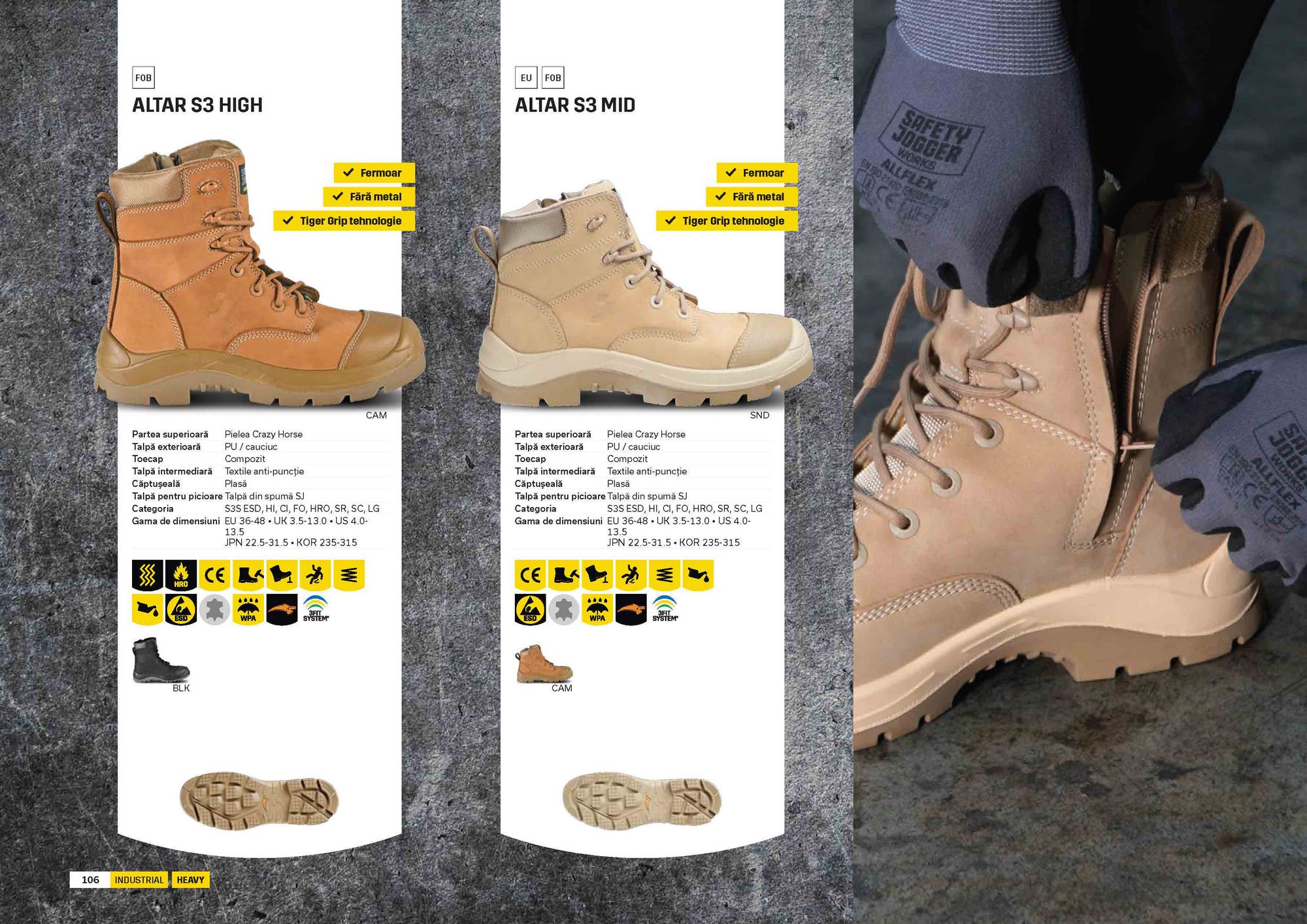 Descripción: Bota de seguridad ALTAR S3: versátil y cómoda, con cremallera lateral. ALTAR S3 es una bota de seguridad diseñada para brindar seguridad y comodidad en entornos exigentes. Ofrece resistencia al deslizamiento SR y una suela resistente al calor, protegiendo en superficies resbaladizas o calientes. La puntera de composite y el diseño sin metal la hacen ligera e ideal para profesionales que pasan frecuentemente por detectores de metales. La parte superior de cuero transpirable e impermeable garantiza comodidad y durabilidad, y la suela exterior de goma antihuellas es resistente a aceites, combustibles y productos químicos. La plantilla extraíble permite personalizarla o usar plantillas ortopédicas. Además, la absorción de energía en la zona del talón y el antepié reduce el impacto en el cuerpo, previniendo el dolor postural y la sensación de pies calientes o sudorosos. Aplicaciones: Construcción, Industria, Logística, Minería. Recomendado para: Entornos secos, Entornos fangosos, Superficies extremadamente resbaladizas, Superficies calientes, Superficies irregulares, Entornos fríos, Entornos húmedos.
