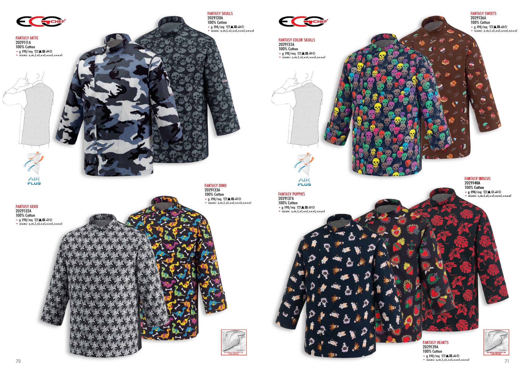 Description: Veste de chef unisexe, avec fermeture sur le devant avec deux rangées de boutons et panneaux arrière en tissu Air Plus respirant. Col tunique. Manche longue. Modèle avec divers imprimés.