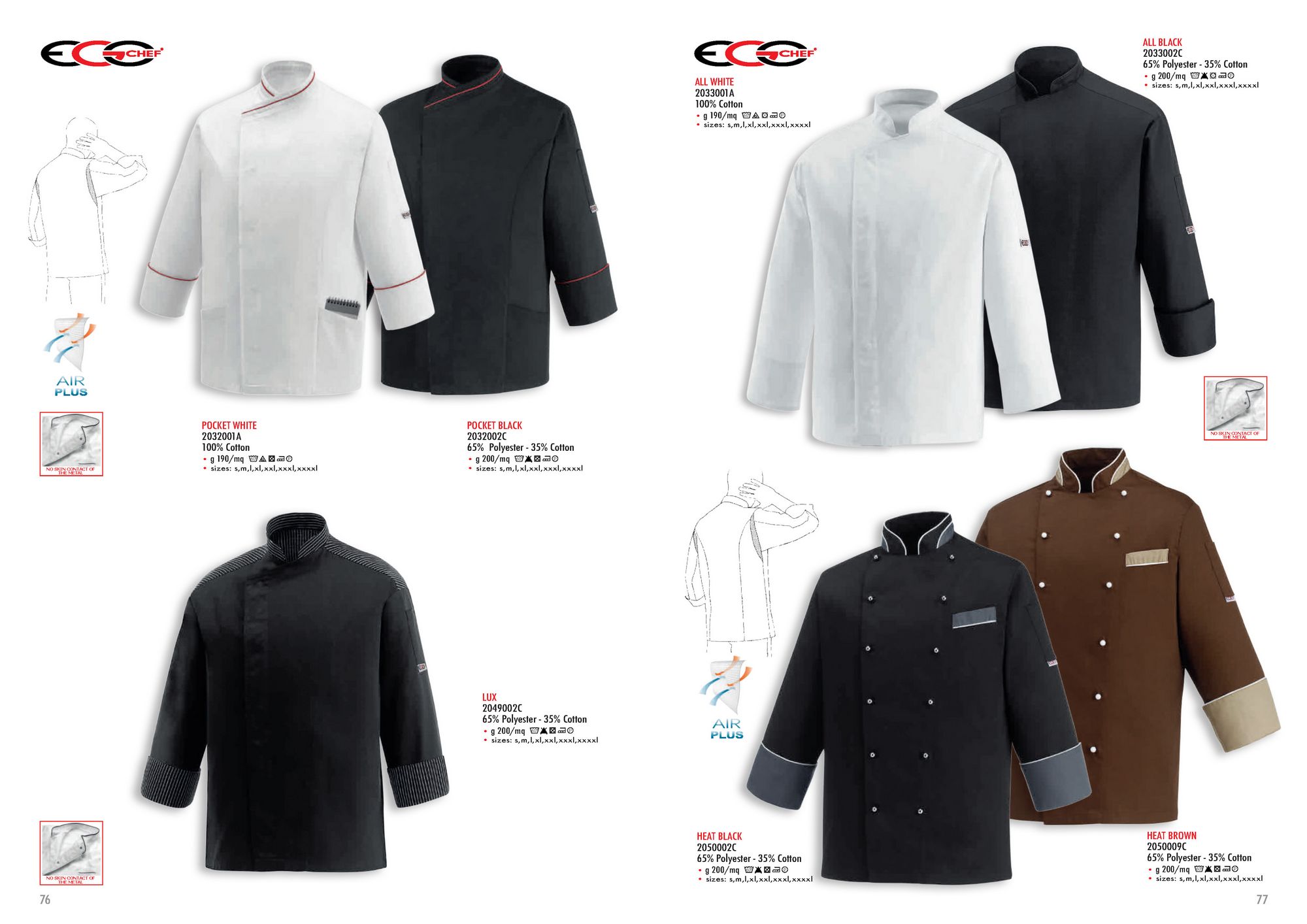 Description: Veste de fête unisexe, fermeture sur le devant avec deux rangées de boutons gris ou blancs et panneaux en tissu Air Plus respirant à l'arrière. Manche longue. Col tunique. Logo Egochef et poche stylo sur la manche gauche. Poche enveloppe appliquée sur la poitrine gauche. Poignets, col et poche pourvus de détails contrastés gris ou crème.