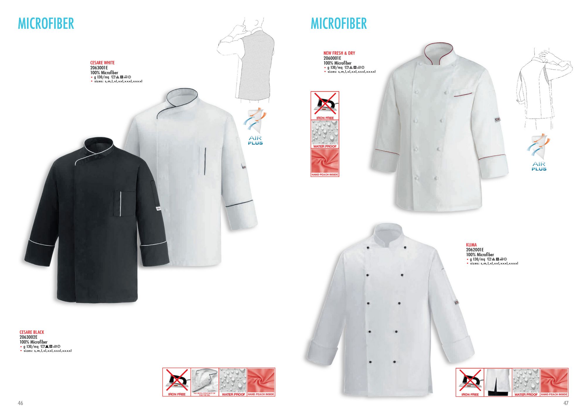 Description: Veste de chef unisexe, fermeture devant avec agrafes et panneaux de tissu respirant Air Plus à l'arrière. Manche longue. Col tunique. Poche avec compartiment stylo appliqué sur la poitrine gauche. Logo Egochef et poche stylo sur la manche gauche. Bordure de couleur contrastée en noir et blanc, respectivement, au col et aux poignets et à la poche poitrine.