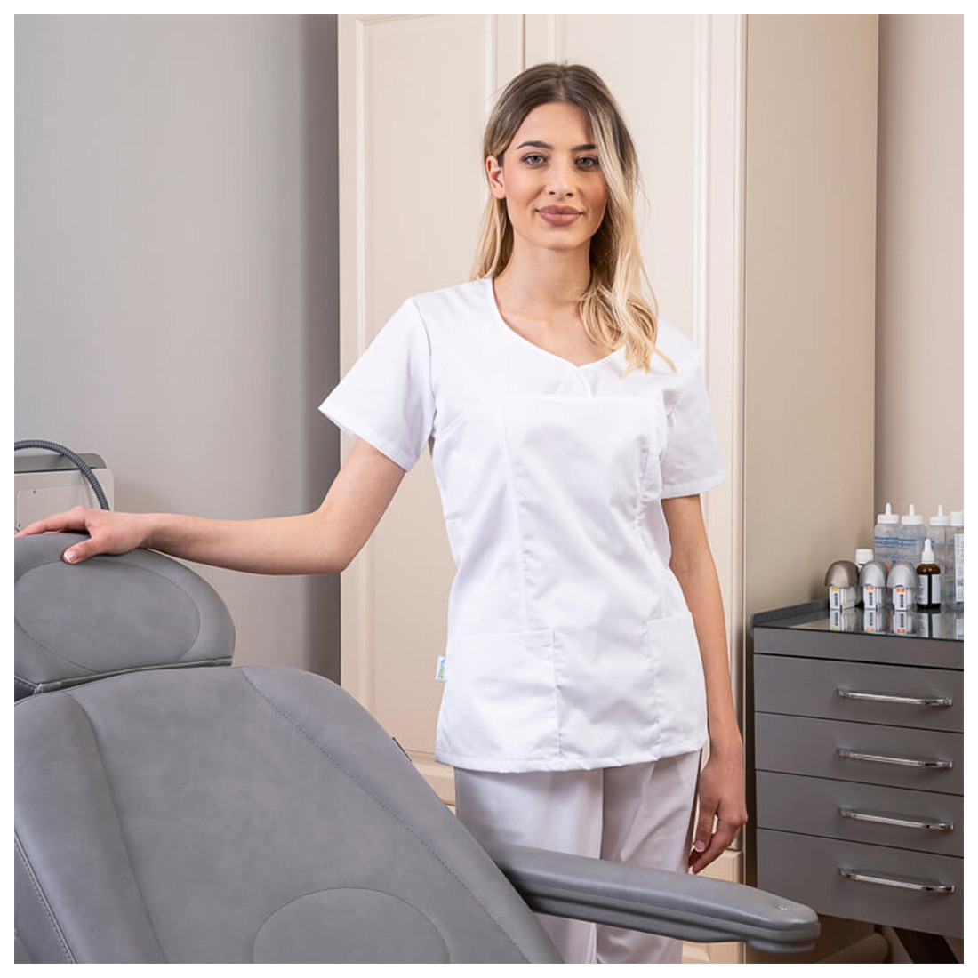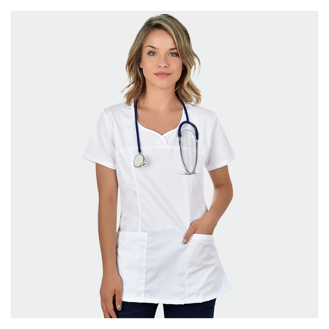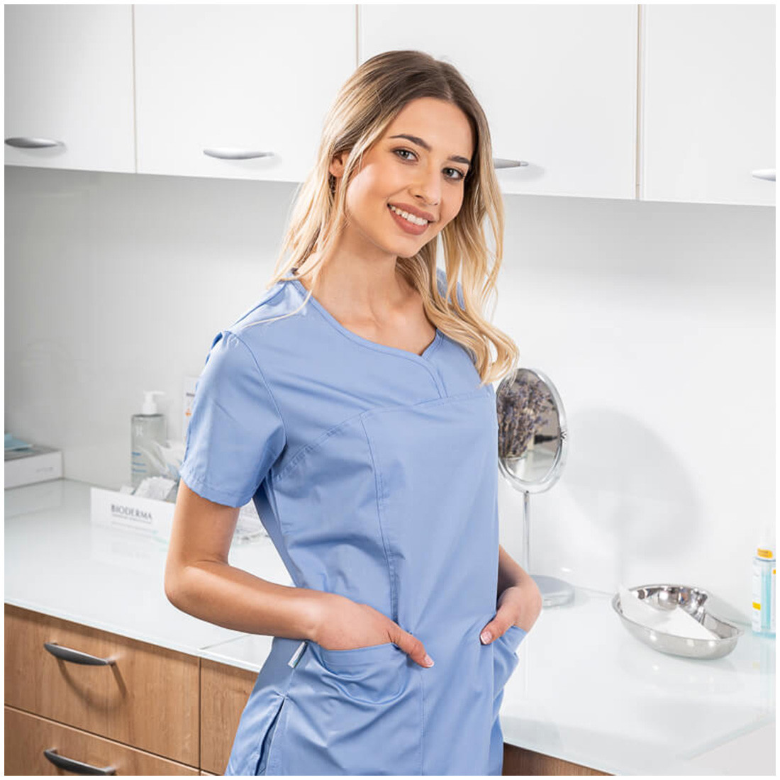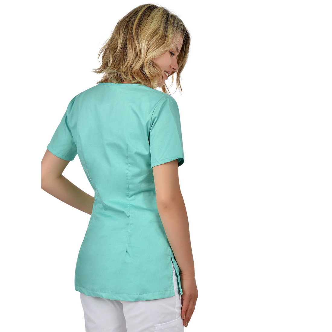 Descriere: Tunica medicala de dama cu maneca scurta. Croiala slim fit. Confectionata din material de inalta calitate, cu tehnologie pentru rezistenta ridicata a tesaturii dupa spalari multiple. Guler in V cu usor arcuit. Doua buzunare in talie. Pense la spate si slituri in laterale.