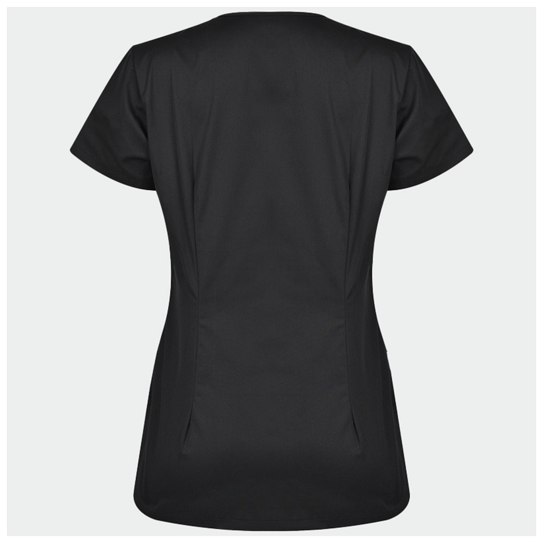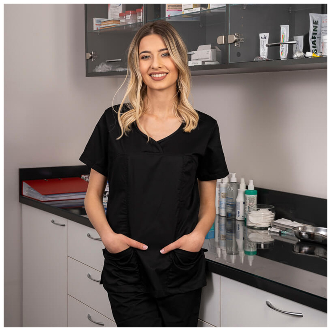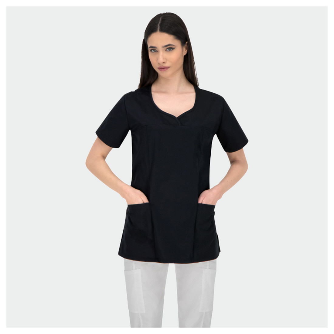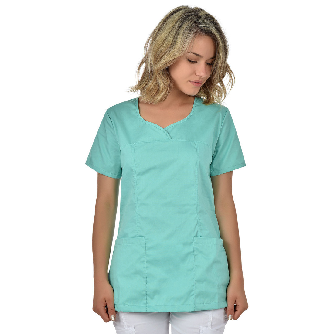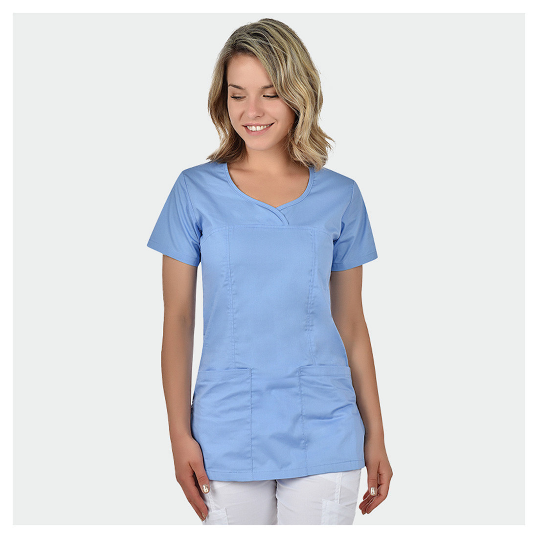 Descriere: Tunica medicala de dama cu maneca scurta. Croiala slim fit. Confectionata din material de inalta calitate, cu tehnologie pentru rezistenta ridicata a tesaturii dupa spalari multiple. Guler in V cu usor arcuit. Doua buzunare in talie. Pense la spate si slituri in laterale.