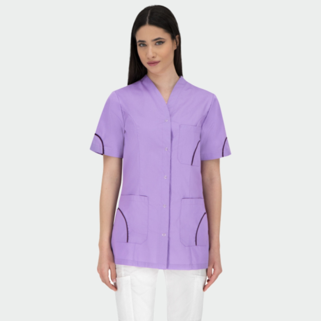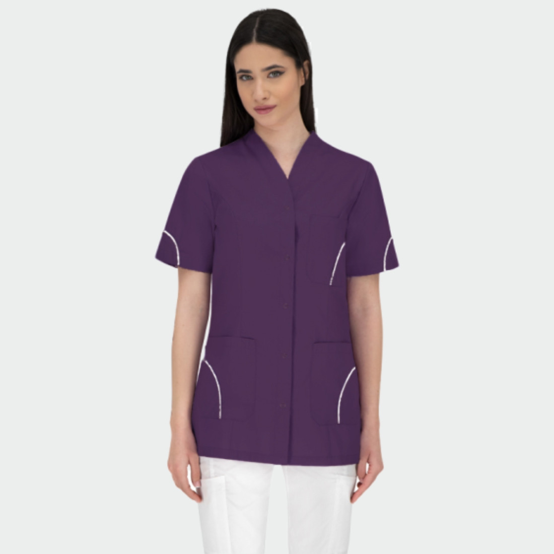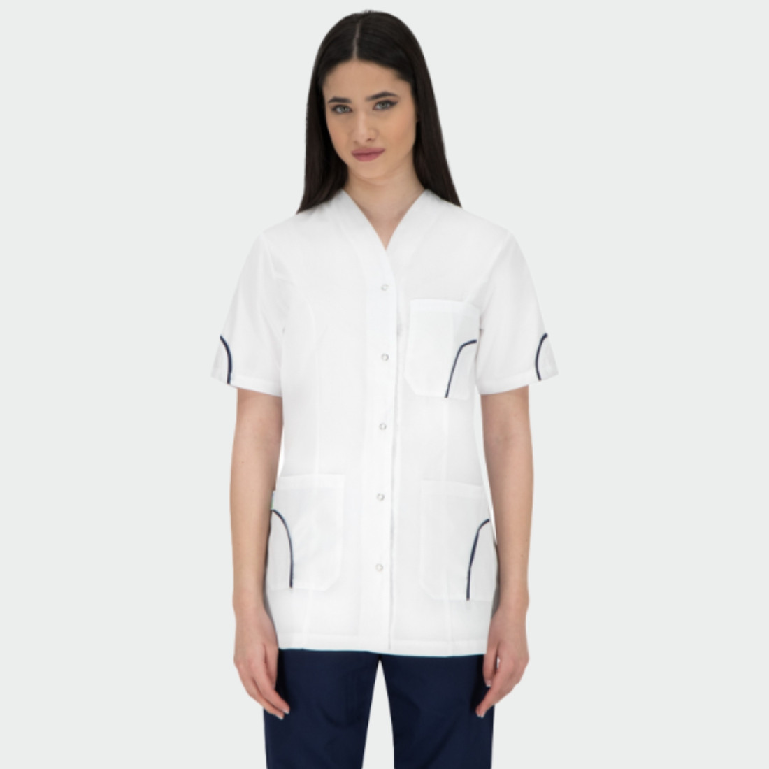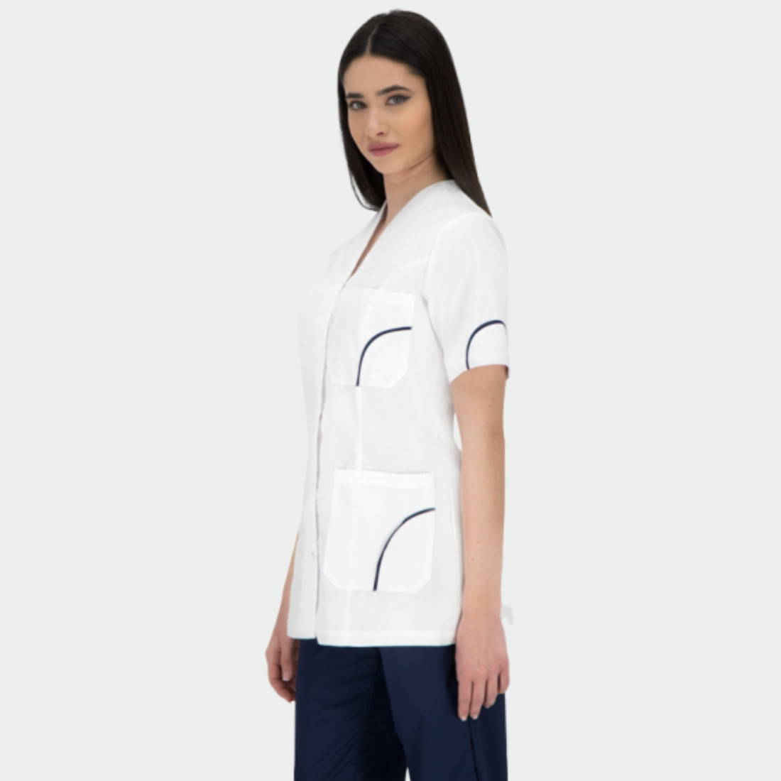 Descriere: Tunica medicala de dama, croiala cambrata, cu insertii de detalii in culoare contrastanta. Maneca scurta rotunjita si insertii detalii contrastante, decolteu tip "esarfa", trei buzunare, inchidere frontala cu capse.