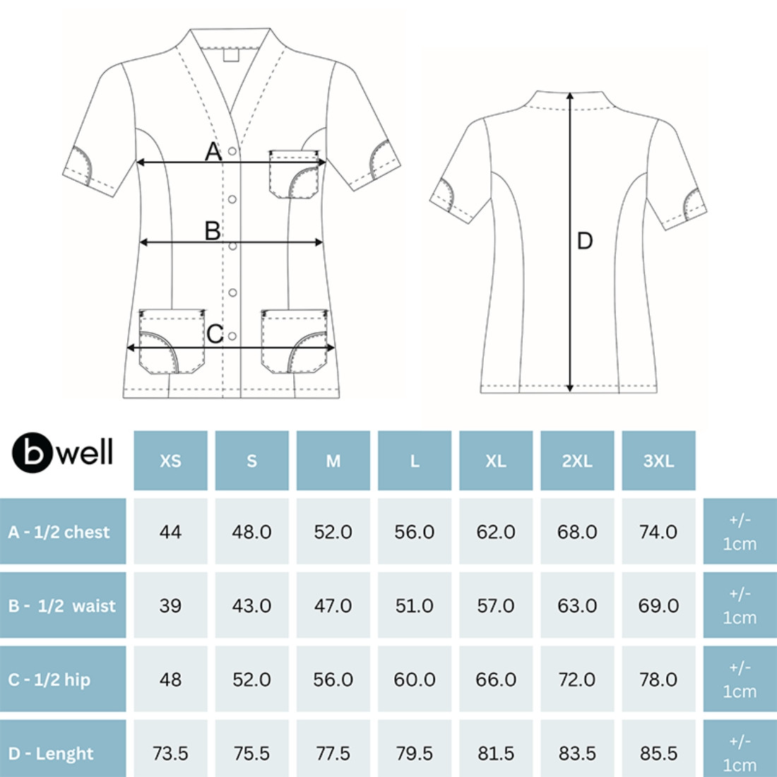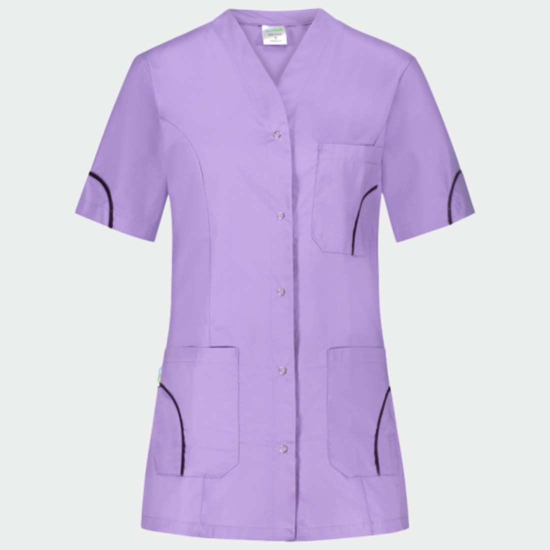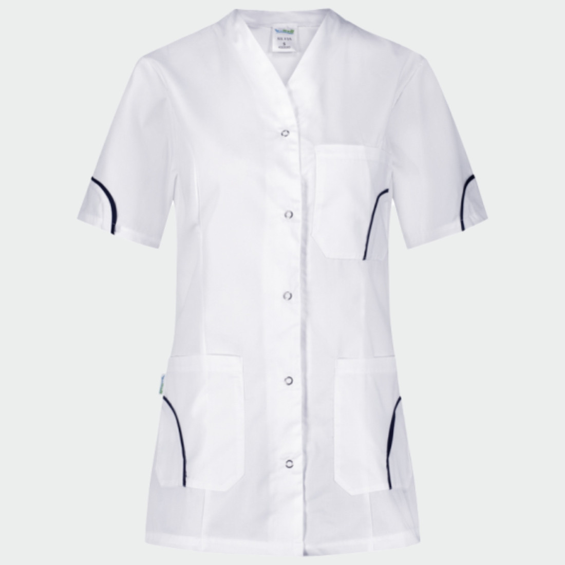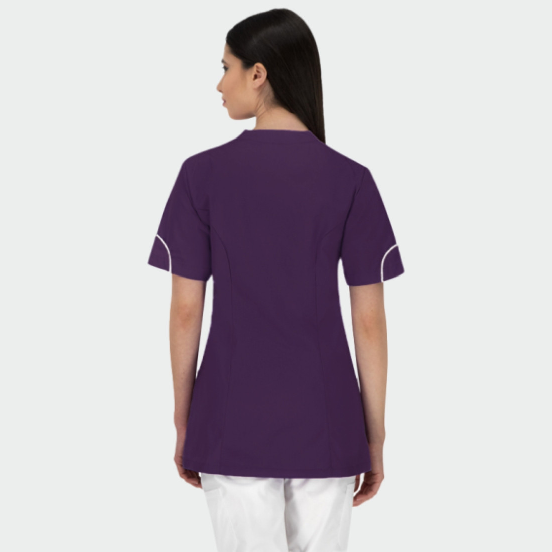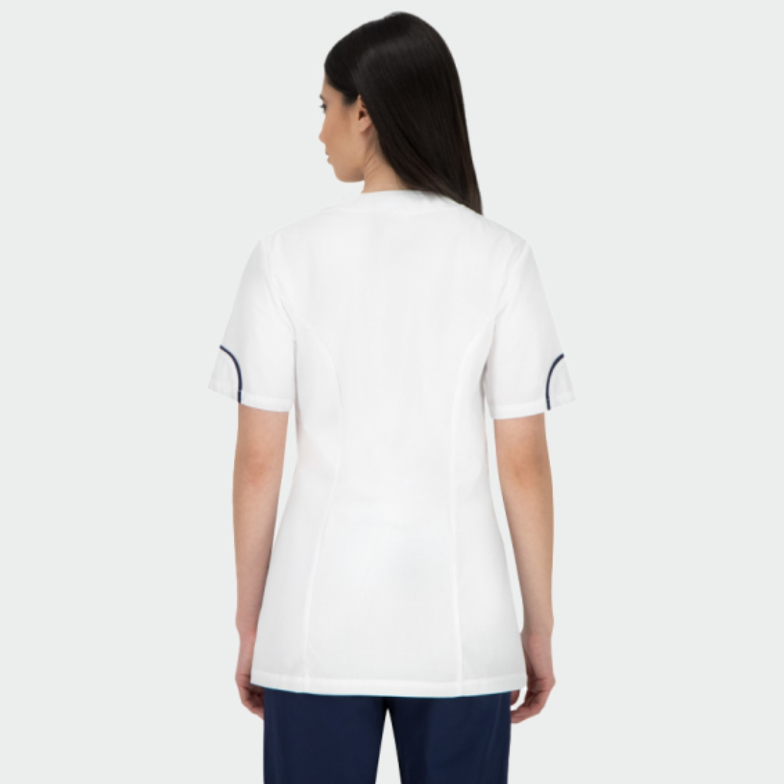 Descriere: Tunica medicala de dama, croiala cambrata, cu insertii de detalii in culoare contrastanta. Maneca scurta rotunjita si insertii detalii contrastante, decolteu tip "esarfa", trei buzunare, inchidere frontala cu capse.