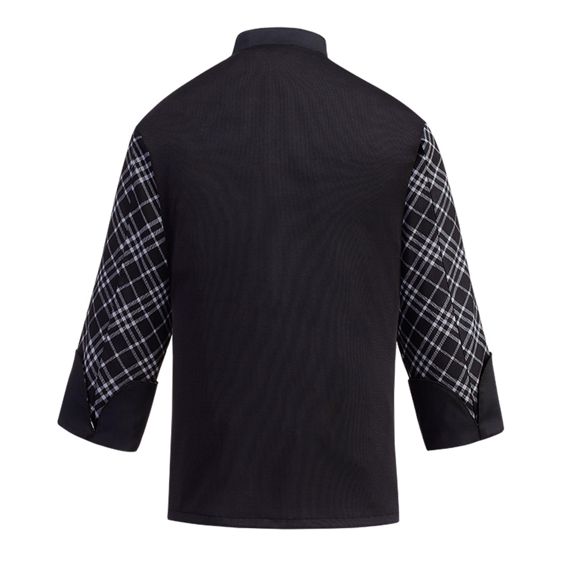 Descriere: Jacheta chef unisex, inchidere frontala cu capse si spate din tesatura respirabila Air Plus de culoare neagra. Imprimeu romburi. Maneca lunga. Guler tunica. Buzunar cu compartiment pentru stilou aplicat pe piept in stanga. Logo-ul Egochef si buzunar pentru stilou pe maneca stanga. Gulerul, mansetele si buzunarul pentru stilou de pe piept sunt in culoare contrastanta negru.