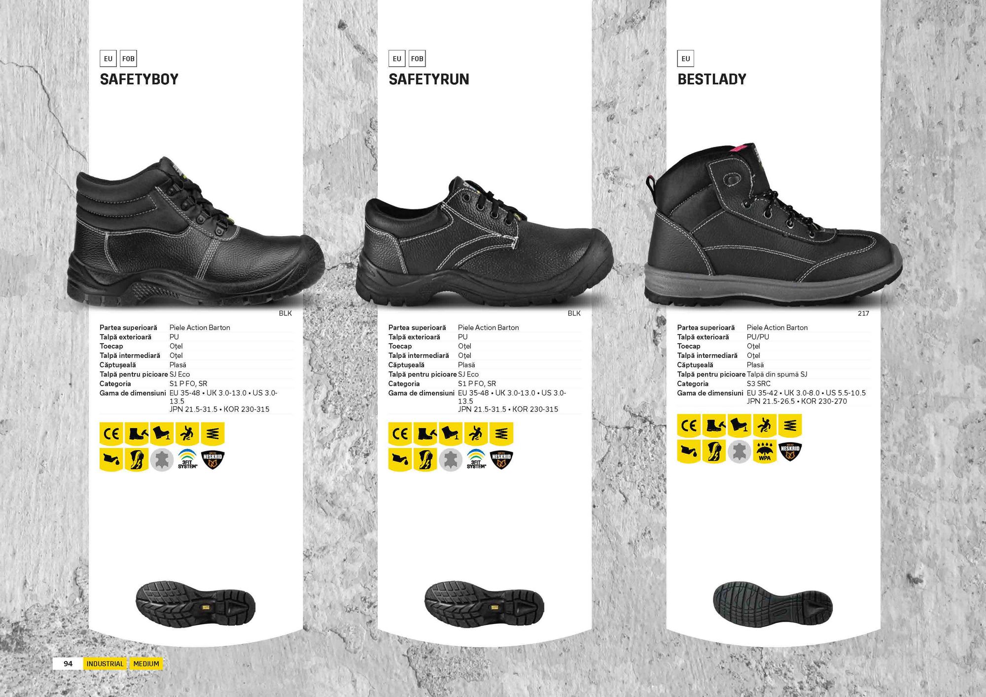 Descriere: Ghete de siguranță din piele pentru protecție zilnică. Aceste ghete de siguranță de înaltă calitate sunt proiectate cu tehnologia S1P, perfecte pentru mediile uscate și care asigură protecția degetelor de la picioare, respirabilitate și rezistența la perforare. Bombeul robust din oțel și talpa intermediară din oțel rezistentă la perforare oferă o protecție superioară împotriva impactului cu obiecte in cadere. Cu o talpă exterioară anti-alunecare, te vei bucura de o aderenta fermă pe orice suprafață, în timp ce brantul personalizabil oferă confort personalizat. Ghetele SAFETYBOY ajută, de asemenea, la ameliorarea durerii data de postura corpului, la prevenirea scânteilor statice și la menținerea picioarelor răcoroase. Potrivite pentru diverse industrii precum auto, minerit și construcții. Fiabile, versatile și prietenoase cu bugetul, ghetele SAFETYBOY sunt alegerea ta pentru o zi de lucru sigură. Industrii recomandate: Automotive, Curățenie, Construcții, Logistică, Minerit, Petrol și gaze, Industrie. Medii Recomandate: Mediu uscat. Standarde de siguranță: S1 P / FO, SR.
